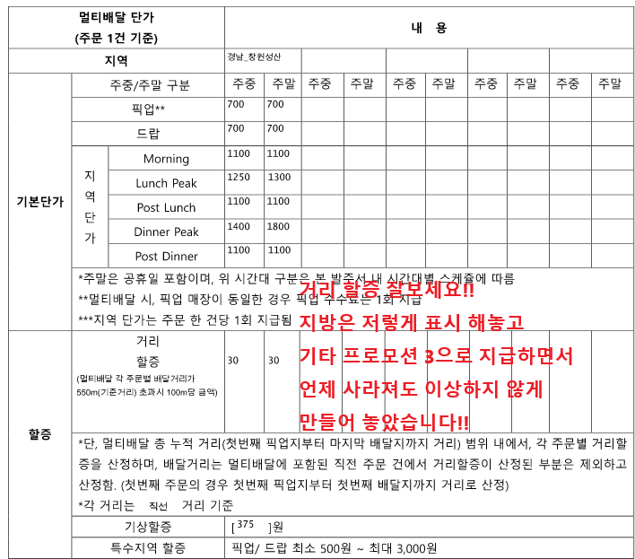 | 단가표 상 멀티배달 기본료 | 픽업비: 700원 + 드랍비: 700원 + 지역단가(Morning): 1,100원 |