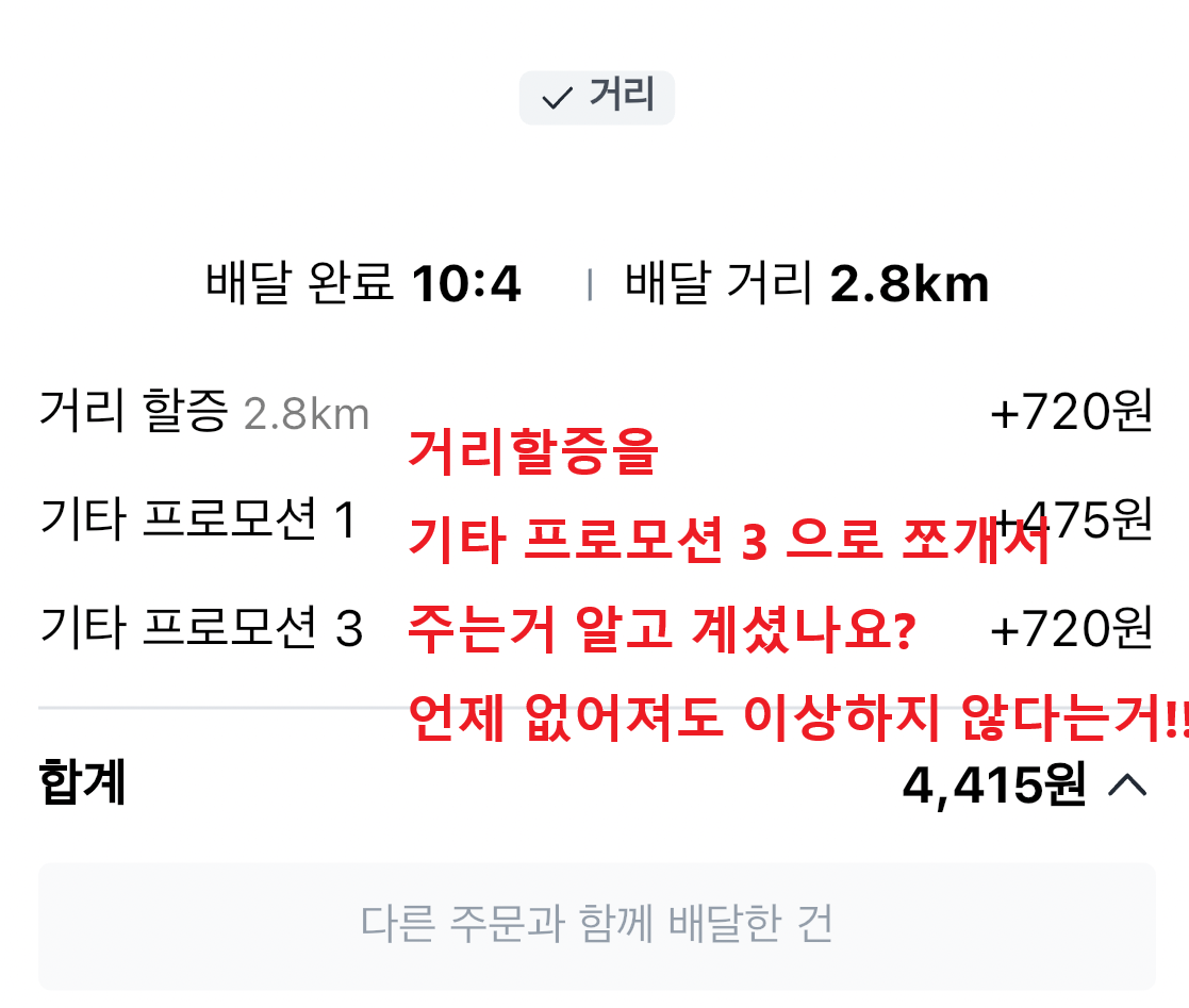 - 지도 위 +N원은 보너스일 뿐: 지도에 뜨는 추가 금액(기타 프로모션1)이나 거리 할증을 또 주는 듯한 '프로모션3'는 언제든 사라질 수 있는 '미끼 상품'에 가까워요. 이것만 보고 배달을 결정하면 나중에 정책이 바뀌었을 때 수입이 크게 줄 수 있으니 조심해야 해요. 🎣